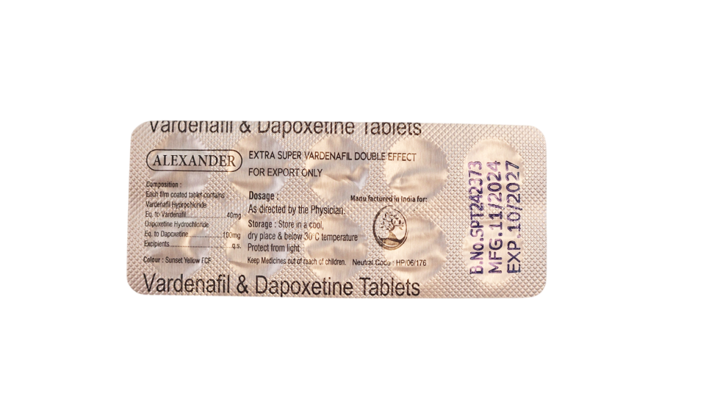 • 알렉산더는 바르데나필 40mg과 다폭세틴 60mg을 함유한 복합 성기능 개선제입니다. 이 약물은 발기부전과 조루를 동시에 치료하는 데 사용됩니다. 바르데나필은 PDE5 억제제로 음경으로의 혈류를 증가시켜 발기를 유도하고 유지하는 데 도움을 줍니다. 다폭세틴은 선택적 세로토닌 재흡수 억제제(SSRI)로 조루를 예방하고 성행위 시간을 연장시킵니다. 일반적으로 성관계 30분에서 1시간 전에 복용하며, 효과는 바르데나필의 경우 4-5시간, 다폭세틴의 경우 약 7시간 지속됩니다. 복용 시 주의사항으로는 과도한 음주를 피하고 고지방 음식과 함께 섭취하지 않는 것이 좋습니다.