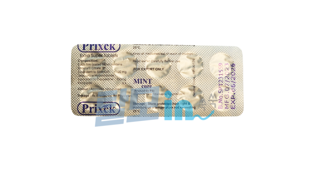 - 프릭스는 실데나필 100mg과 다폭세틴 100mg을 함유한 복합 성기능 개선제입니다. 이 제품은 발기부전과 조루를 동시에 치료할 수 있는 약물로, 성관계 약 1시간 전에 복용합니다. 실데나필은 PDE5 효소를 억제하여 발기를 유도하고 지속시키며, 다폭세틴은 세로토닌 농도를 높여 조루를 예방합니다. 효과는 복용 후 30분에서 1시간 내에 나타나며, 실데나필의 효과는 약 4-6시간, 다폭세틴의 효과는 약 7시간 지속됩니다. 일반적으로 1일 1회 복용을 제한하며, 과도한 음주나 고지방 음식과 함께 섭취하는 것은 피해야 합니다.